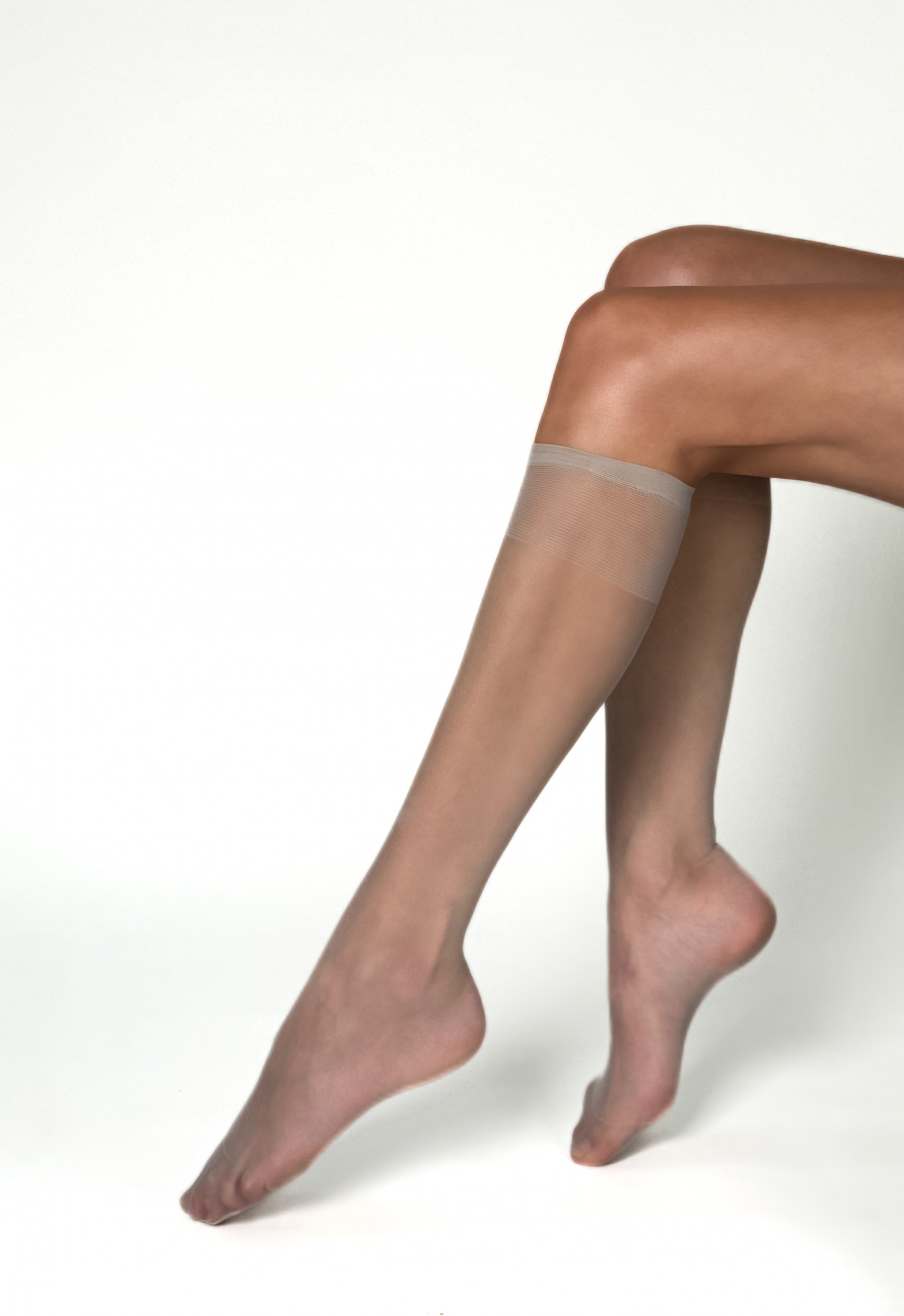 Schicke Spiga Lurex Kniestrümpfe von Veneziana, 15 Denier. Sie zeichnen sich durch ein Muster mit Lurex-Querstreifen aus. Sie haben eine breite Manschette. Perfekt für Culotte-Hosen mit freiliegendem Knöchel.